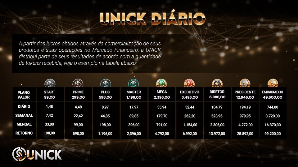 👉 1- Unick Diário- Participação de Lucro diário de 1.5% a 3%